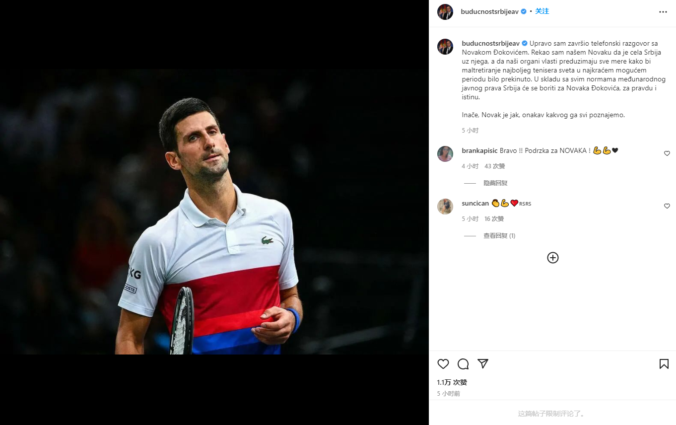 “我告诉诺瓦克,整个塞尔维亚都和他在一起。我们的当局正在采取一切措施,在最短时间内制止这场针对世界头号球员的骚扰。根据国际公法的所有准则,塞尔维亚将为德约科维奇而战,为正义和真理而战。并且我们都知道,诺瓦克很强大。”