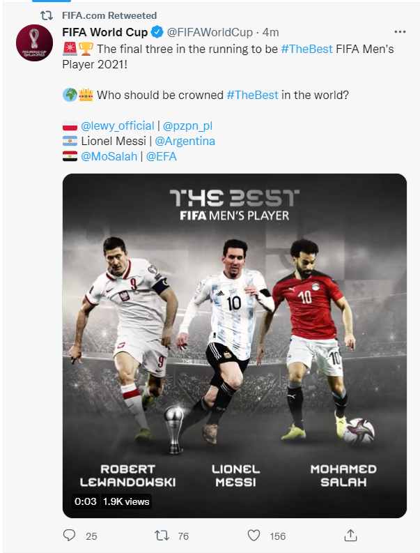 北京时间1月7日,FIFA公布世界足球先生最终三人候选公布,三名候选人为梅西、莱万、萨拉赫。