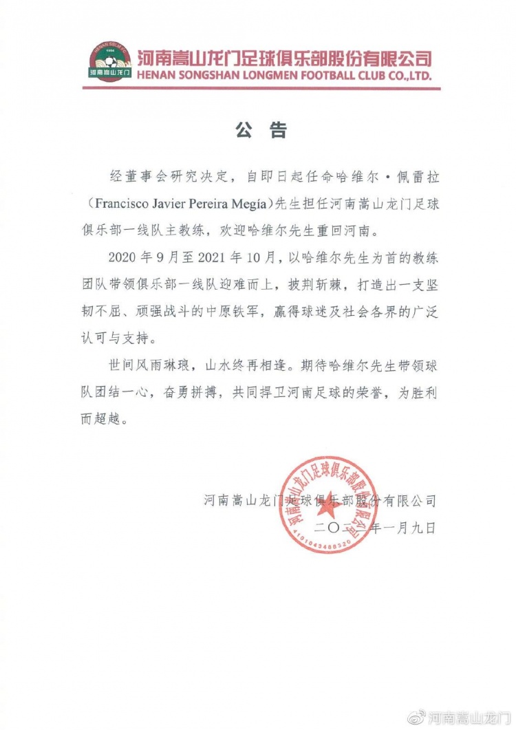 北京时间1月9日,河南嵩山龙门官方宣布哈维尔·佩雷拉重回河南,担任一线队主教练。
