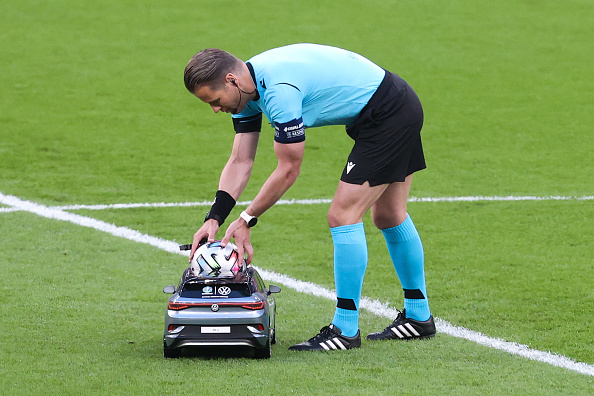 比赛开球之前,一辆遥控小车将比赛用球带进球场,小车在中圈弧中来了一个漂亮的甩尾,停到了主裁判王哲的面前。王哲将球接过放在开球点处,比赛随后宣布开始!