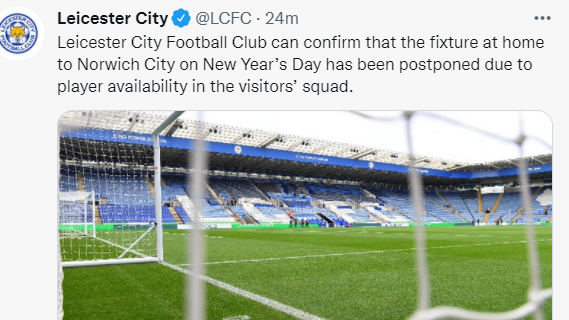 英超联盟委员会接受了莱斯特城的申请,因为该俱乐部由于新冠病例、伤病和在非洲国家杯上参加国家队比赛的球员,没有达到比赛所需的球员数量(13名外场球员和一名门将)。