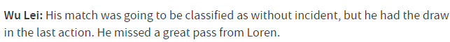 武磊本场比赛第90分钟才替补登场,第96分钟,他在门前抢点射门,无奈没有打上力量,被对手门将没收。