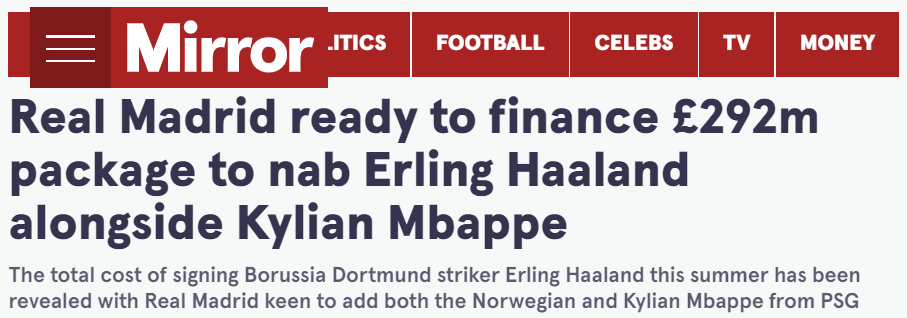 据《镜报》报道,皇家马德里正在准备一项总额为2.92亿英镑的引援计划,目标是签下多特蒙德前锋哈兰德。