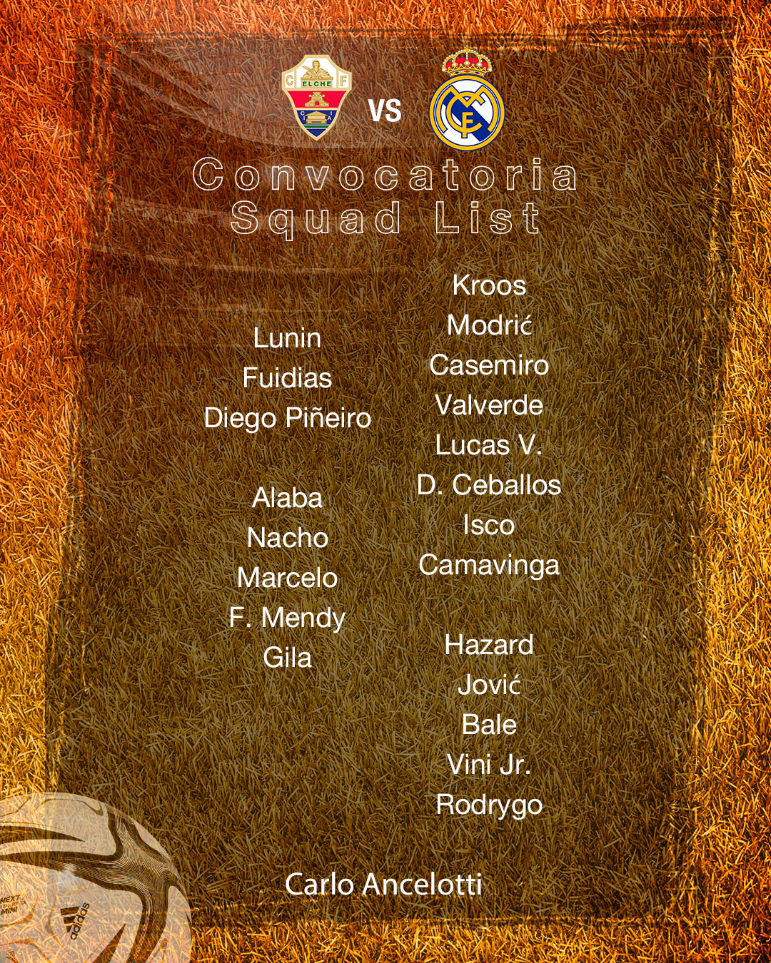 北京时间1月19日,皇家马德里公布了国王杯对阵埃尔切的球队大名单,魔笛领衔,贝尔回归,小将希拉入选,本泽马、库尔图瓦缺席,米利唐执行超级杯红牌停赛无缘。