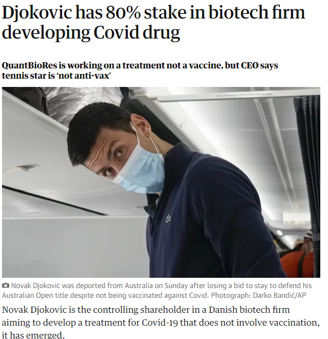 北京时间1月20日,外媒消息,德约科维奇是一家丹麦生物技术公司QuantBioRes的控股股东,2020年6月投资入股。该公司意在开发一种抑制冠状病毒感染人体细胞的肽。