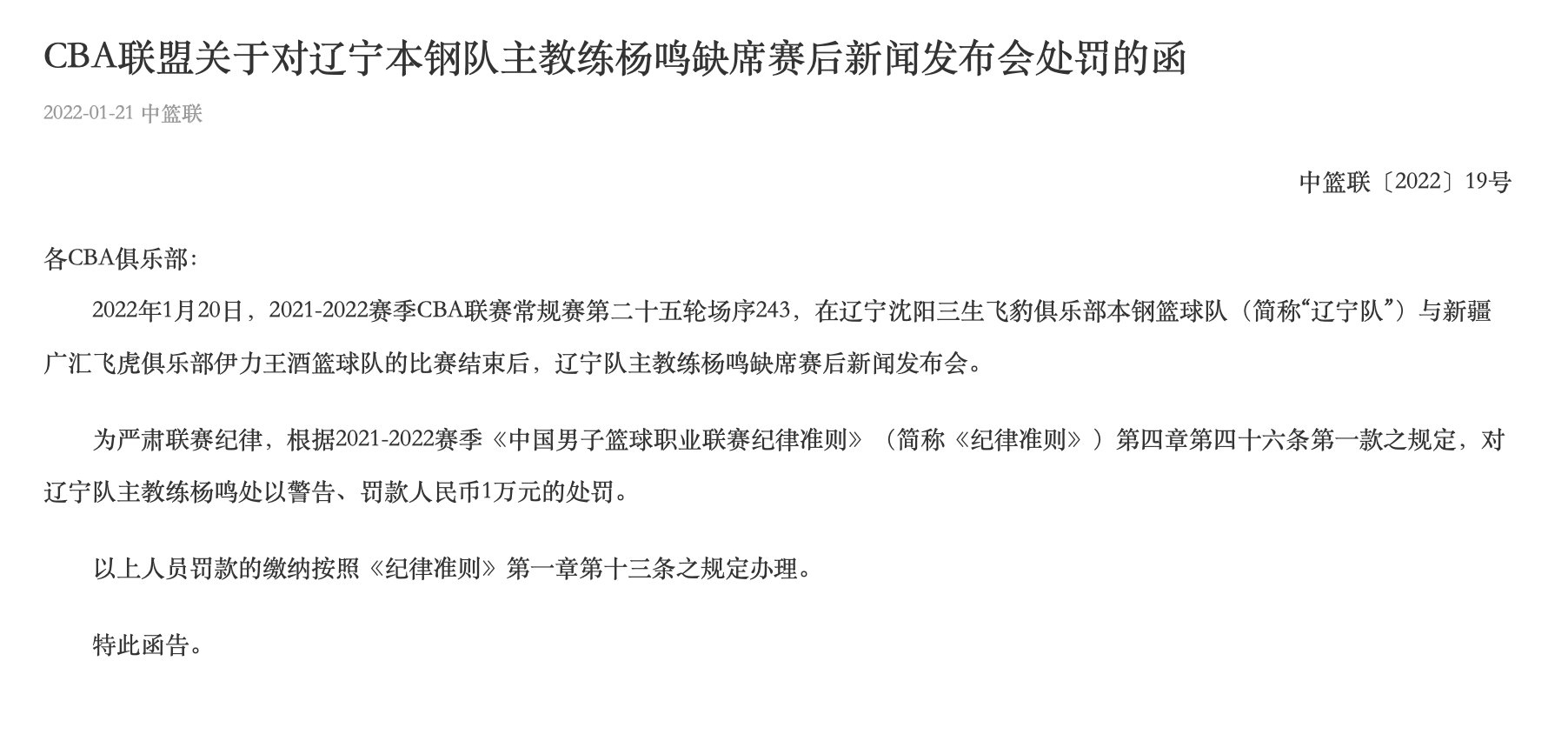 为严肃联赛纪律,根据2021-2022赛季《中国男子篮球职业联赛纪律准则》(简称《纪律准则》)第四章第四十六条第一款之规定,对辽宁队主教练杨鸣处以警告、罚款人民币1万元的处罚。