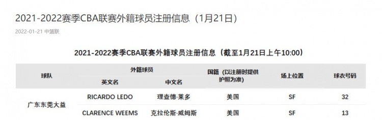 北京时间1月21日,CBA官方更新了外援注册信息。