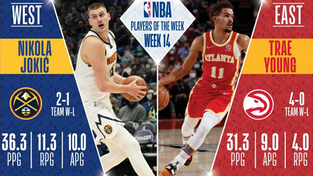 北京时间1月25日,NBA官方公布了第14周东西部周最佳球员,掘金球星尼古拉-约基奇当选西部周最佳,老鹰球星特雷-杨当选东部周最佳。