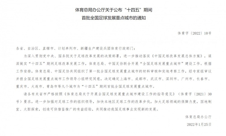 为深入贯彻党中央、国务院关于足球改革发展的决策部署,进一步推动落实《中国足球改革发展总体方案》,谋深做实“十四五”期间足球改革发展工作,体育总局、中国足协联合开展“全国足球发展重点城市”建设工作。根据工作安排,体育总局、中国足协共同组织了第一批全国足球发展重点城市的材料审核和实地考察工作,经专家组审议并报全国足球发展重点城市工作领导小组研究同意,决定确定上海市、成都市、武汉市、深圳市、广州市、长春市、重庆市、大连市、青岛市等九个城市为“十四五”期间首批全国足球发展重点城市。
