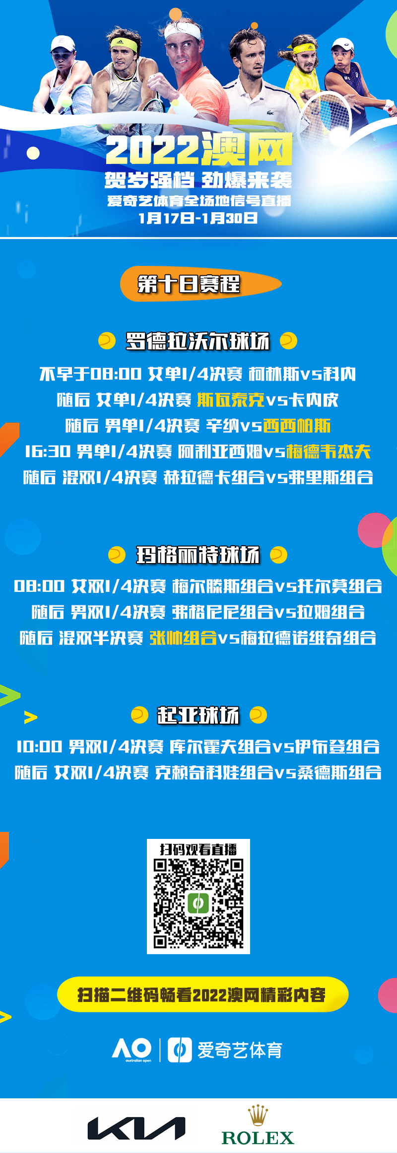 导语:北京时间1月26日,2022年澳大利亚网球公开赛将进入到第10个比赛日的争夺,男女单打下半区的四强席位也将花落有主。