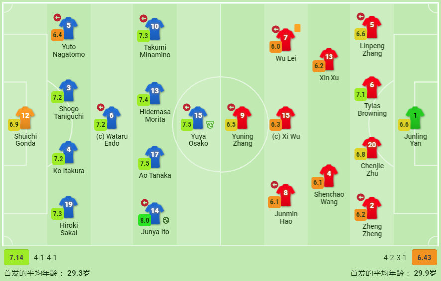 根据Sofascore的赛后评分,中日大战中首发的武磊获得了全场最低的6.0分,国足阵中得分最高的是蒋光太,但他7.1的评分甚至不及日本的平均得分。