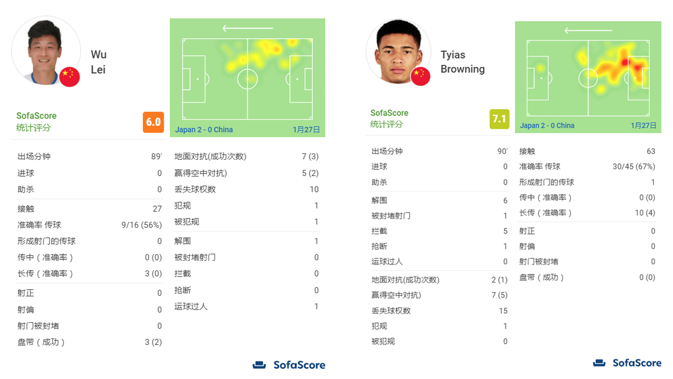 评分显示,日本队的首发11人9人评分超过7分,最高分为打进全场比赛第二球的伊东纯也的8分。中国队方面,武磊仅获6.0分。本场比赛,武磊16脚传球成功9次,长传3传0中,在进攻端几乎没有机会,10次丢失球权。国足首发11人中唯一的归化球员蒋光太获得队内最高的11分,他在防守端做出了不小的贡献。完成6次解围、5次拦截、1次抢断、1次封堵。
