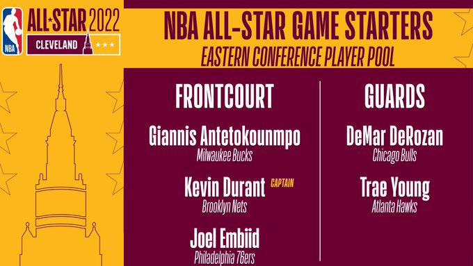 东部:杜兰特(C)、字母哥、恩比德、德罗赞、特雷·杨。杜兰特将成为球队队长,因为他是东部球迷票数最多的全明星首发球员。