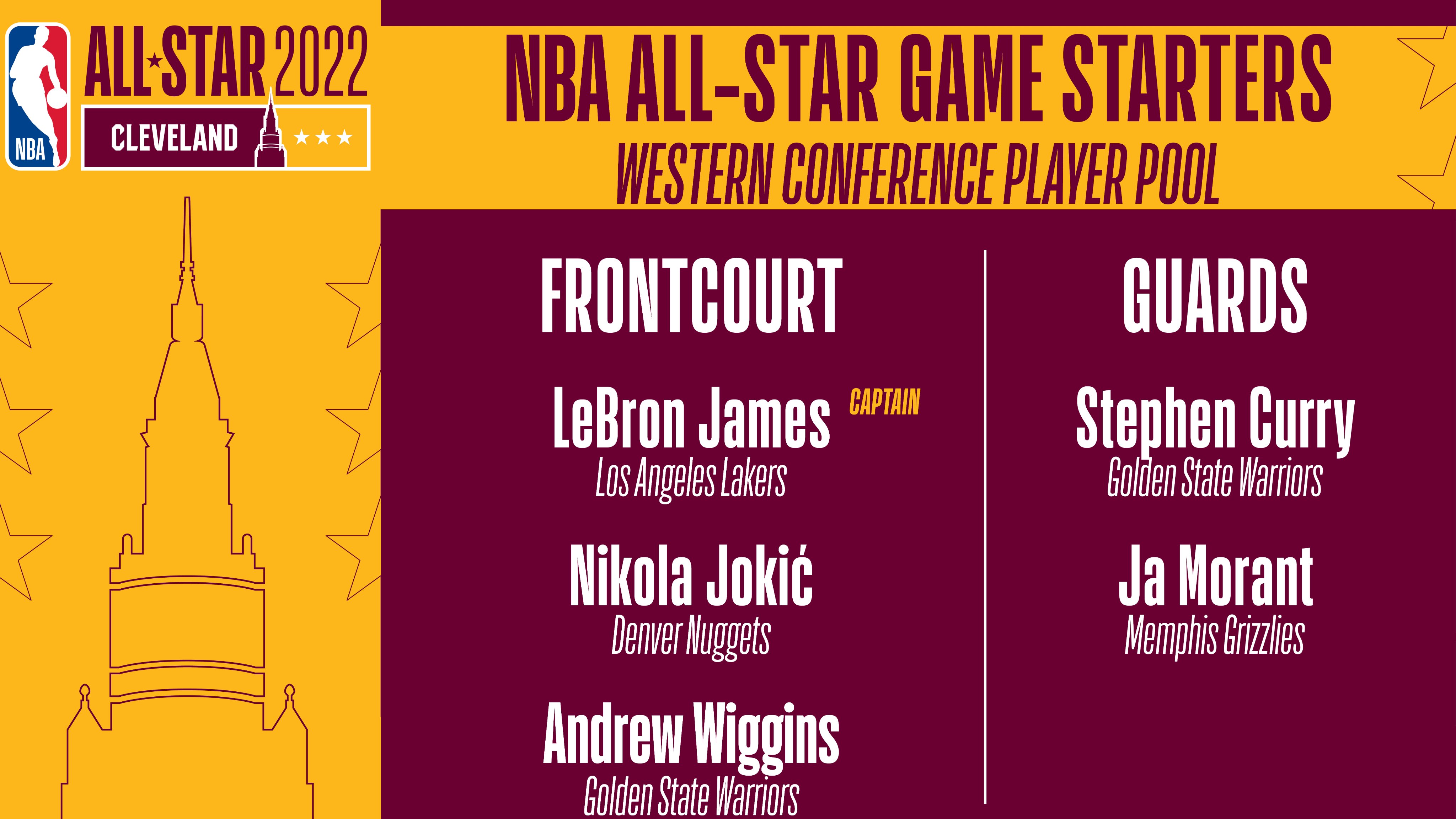 西部:詹姆斯(队长)、库里、约基奇、维金斯、莫兰特。詹姆斯将成为球队队长,同样他是西部球迷票数最多的球员。