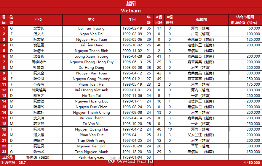 北京时间今晚20:00,国足将在客场对阵越南队。赛前越南公布本场比赛23人大名单,阮文全、阮进灵二人结束隔离复出领衔,阮光海在列。