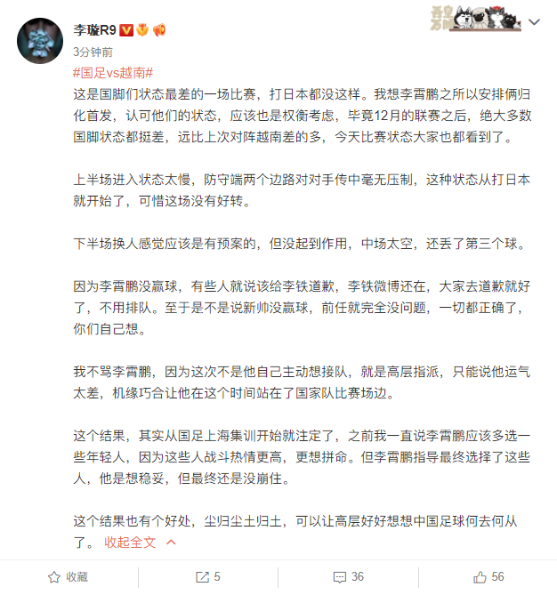 国足在大年初一遭遇了一场1-3的完败,这使得中国球迷以及媒体人都觉得难以接受,有人抛出老梗,有人长篇大论,也有人字里行间都显示出崩溃。