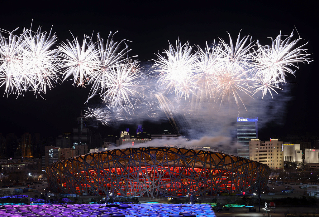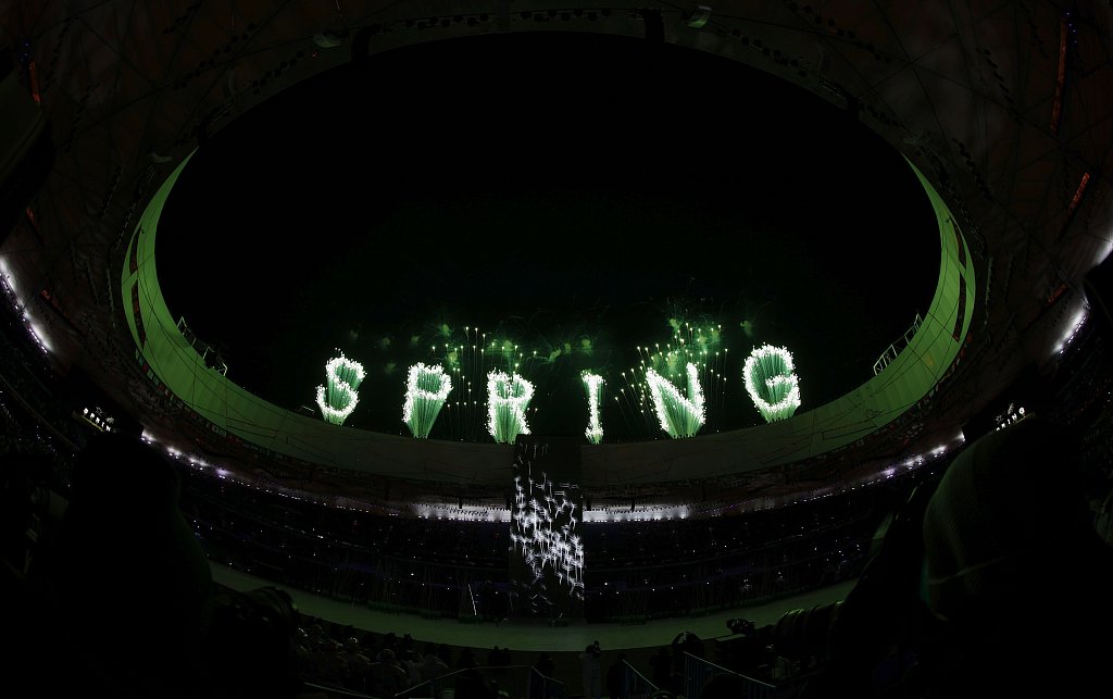 开幕式倒计时结束一刹那,“鸟巢”上空,焰火打出了“立春”“SPRING”字样。伴随着北京冬奥会正式开幕,一棵由焰火组成的“迎客松”出现在空中。它姿态优美奇特,一侧的枝杈伸出,像一个人伸出一只臂膀,欢迎远道而来的客人。鸟巢上空火树银花。中国人正用自己的方式表达对全世界来宾的欢迎。