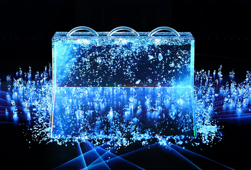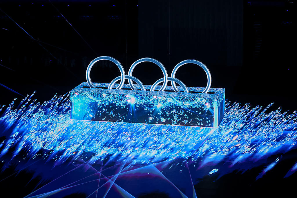 6个冰球运动员与影像冰球击打互动,冰球在视频空间中反复撞击后,整块冰立方渐渐碎裂、雕刻成为一个晶莹剔透的冰雪五环。“破冰”寓意着打破隔阂、互相走近,大家融为一体。