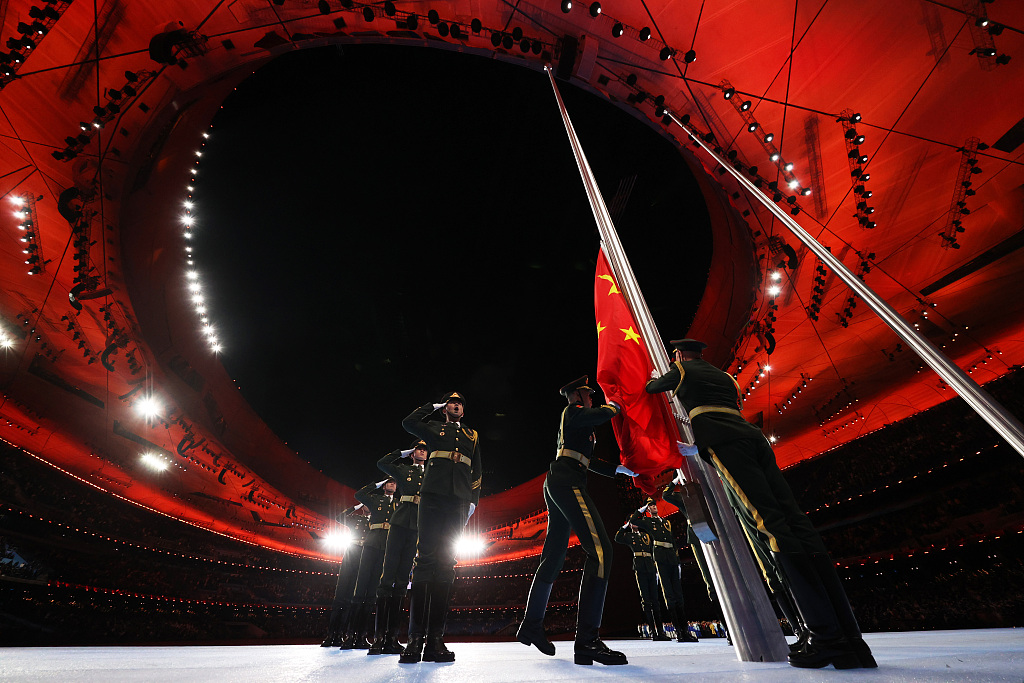 鸟巢中央,一面五星红旗在12位小朋友手中徐徐展开。随后,他们将国旗传递给176名代表。经由一双双炽热的手,鲜艳的国旗被郑重地交给国旗班手里。
