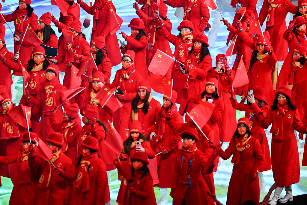 在歌唱祖国的乐曲声中,中国代表团入场了!钢架雪车女将赵丹和速度滑冰名将高亭宇担任中国代表团开幕式旗手。