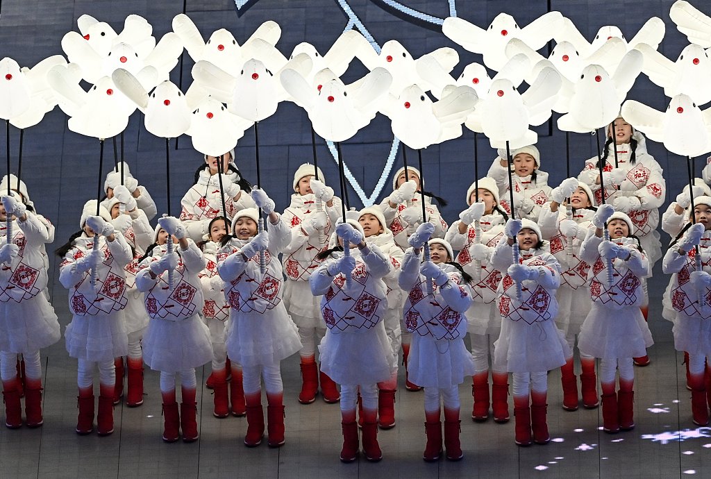 在开幕式的《雪花》篇章里,几百个孩子手持和平鸽形状的道具灯,在鸟巢中无拘无束地起舞、游戏,一曲童声合唱的《雪花》悠扬清澈,天真动人!在张艺谋看来,这是整场开幕式中最打动自己的部分。