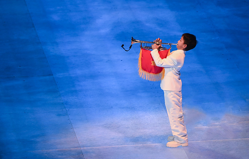开幕式国旗传递环节,一名小男孩站在旗杆下,用小号吹响了嘹亮深情的《我和我的祖国》。小号声响起的瞬间,全世界观众的目光都落在这个稚嫩可爱的孩子身上。