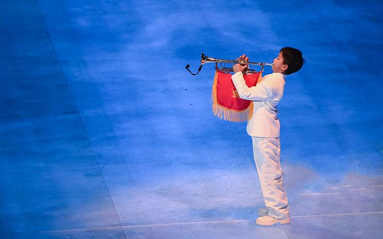 开幕式国旗传递环节,一名小男孩站在旗杆下,用小号吹响了嘹亮深情的《我和我的祖国》。小号声响起的瞬间,全世界观众的目光都落在这个稚嫩可爱的孩子身上。