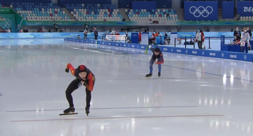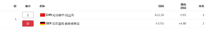 中国选手阿合娜尔与奥运会纪录保持者佩希施泰因在第一组,阿合娜尔内道出发,对手外道出发。佩希施泰因已是一名49岁的老将,阿合娜尔只有22岁。中国选手阿合娜尔滑出4分12秒28。
