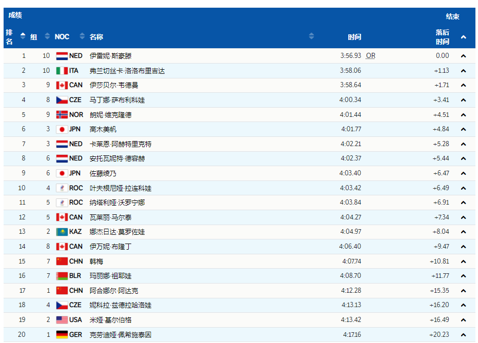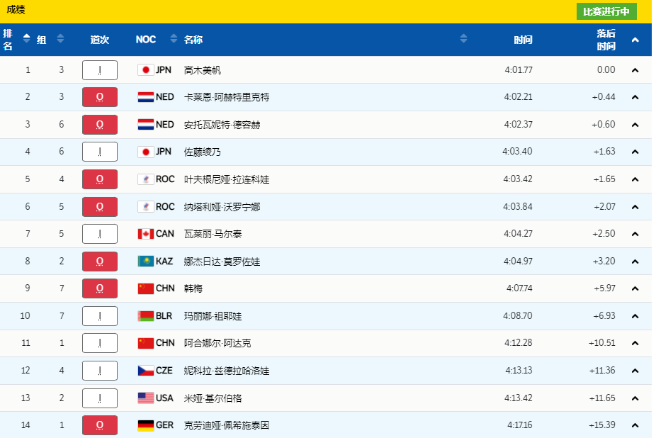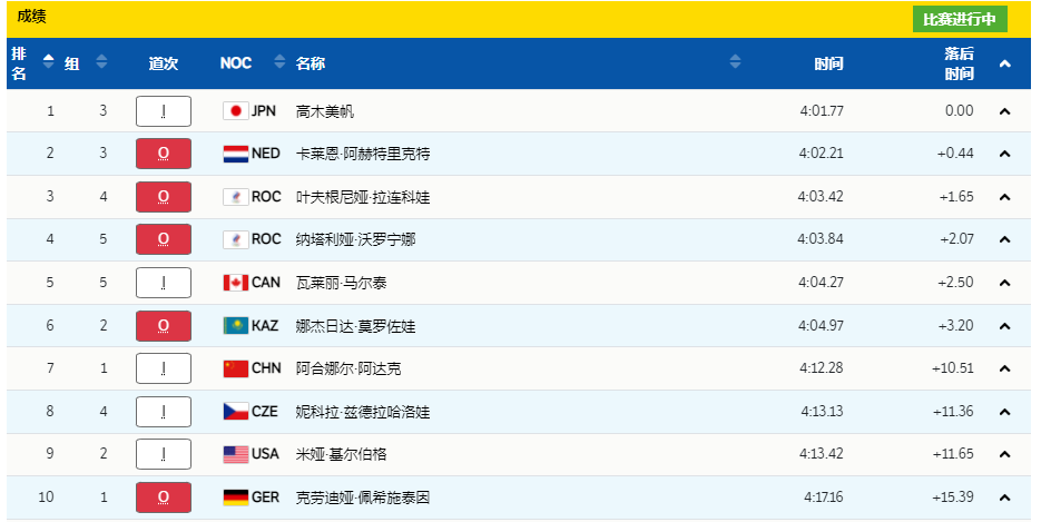 前5组过后,日本选手高木美帆暂列第一,阿合娜尔排名暂为第7。