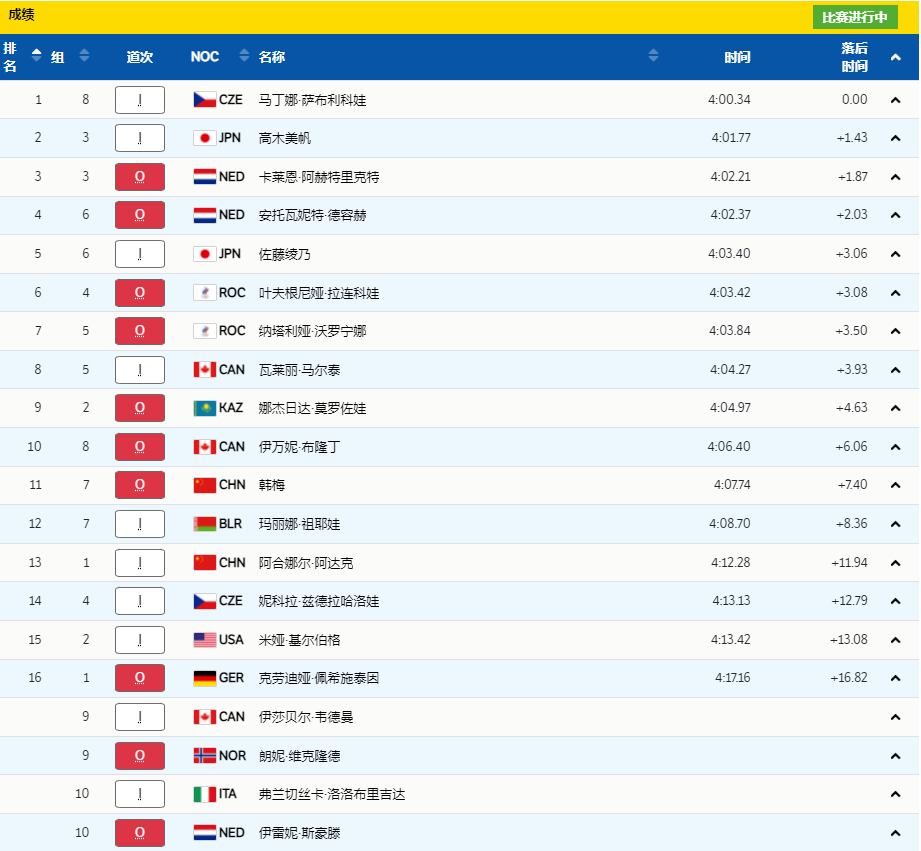 第8组出场的萨布利科娃滑出4分0秒34的成绩跃居第一名。