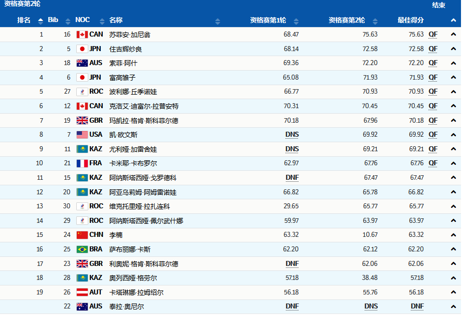 第一位出场的法国选手卡布罗尔30.75秒过线,最终得分67.76分。