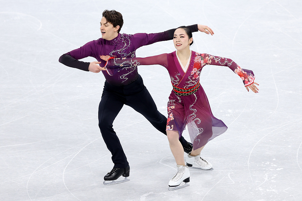 日本组合率先登场,两人整套动作没有出现较大失误,无论是舞蹈旋转、编排撵转和托举的难度动作,两人顺利完成。最终获得技术动作54.29分,节目内容分44.37分。总分98.66分。
