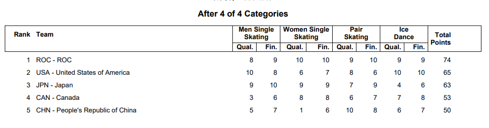 最终,俄罗斯奥委会代表队以总分74分斩获花滑团体赛的金牌,美国队以65分获得银牌,日本队仅以2分之差位列第三获得铜牌。中国队获得50分位列第五。