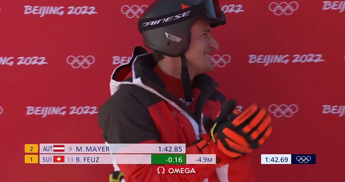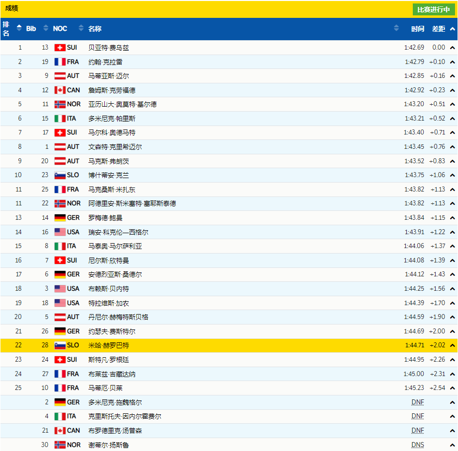 第9位登场的奥地利名将马蒂亚斯·迈尔滑出1分42秒85的好成绩超过同胞暂时第一!
