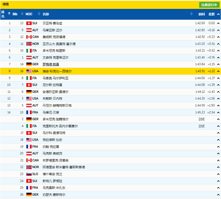 参加过4届奥运的法国名将克拉雷滑出1分42秒79,41岁老将冲入第2名。全场选手给老将鼓掌。