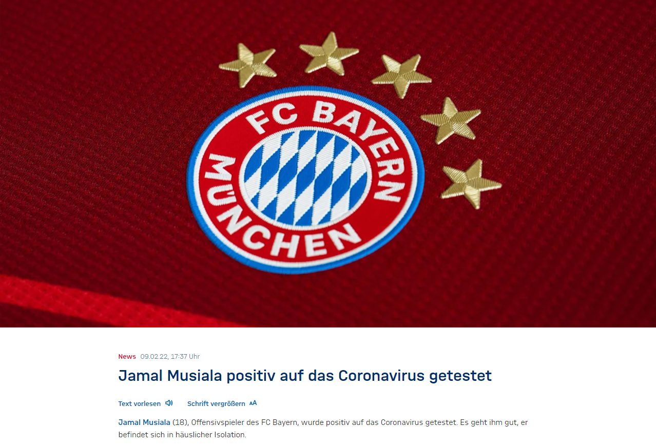 拜仁官方公告中说道:“球队攻击手穆夏拉在新冠检测中呈阳性,目前球员状况良好正在隔离阶段。”