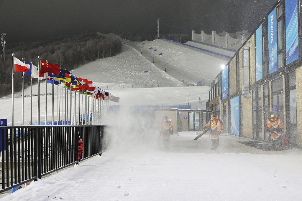 国家越野滑雪中心场馆的山地运行团队提前启动应急机制,安排20人的清雪队伍,对5公里赛道进行吹雪作业,全力保障赛事运行。