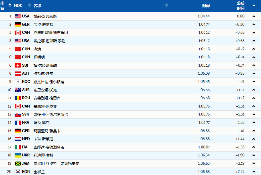 美国选手汉弗莱斯以1:04.44的成绩在第一轮后排在首位,德国人诺尔特1:04.74排名第二,加拿大人德布鲁因和美国选手泰勒以1:05.12的成绩并列排在第三位。