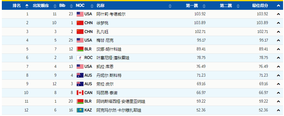 第1位出场的白俄罗斯选手安德里亚纳娃,第二跳动作是难度系数2.850的Back Full-Tuck,平稳落地后,得到70.11分;
