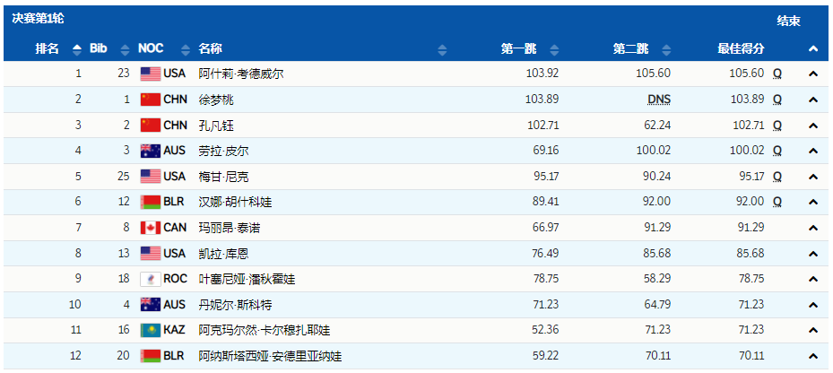 中国选手徐梦桃第10位出场,动作是难度系数4.028的Back Lay-Full-Full。整套动作毫无瑕疵,平稳落地后得到103.89分;