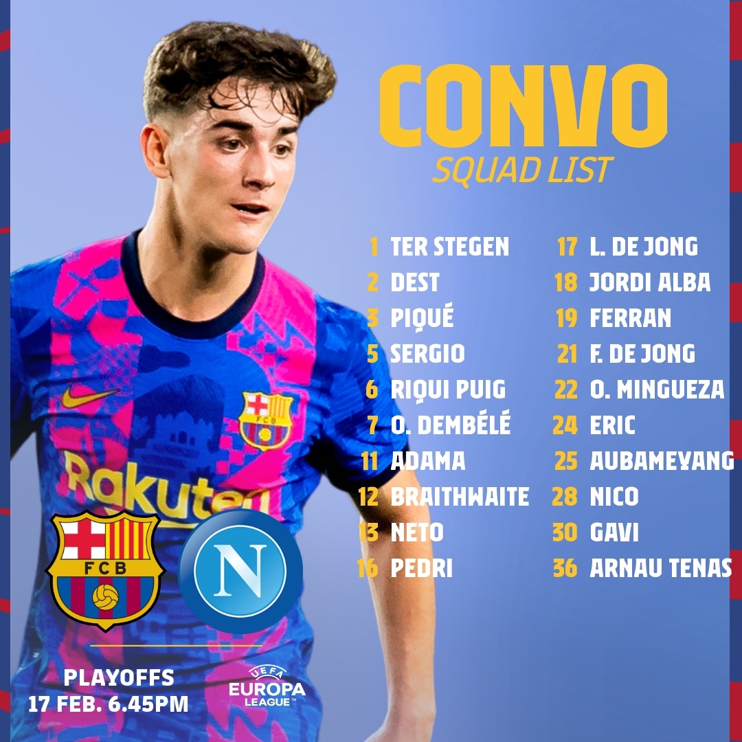 北京时间2月17日,巴塞罗那官方公布了本轮欧联杯淘汰赛附加赛首回合主场对阵那不勒斯的球队大名单——罗纳德-阿劳霍、德佩、朗格莱等人因伤无缘,奥巴梅扬、阿达玛-特劳雷和费兰-托雷斯3大新援在列,老将阿尔维斯由于未被注册入欧联杯名单无法出战。