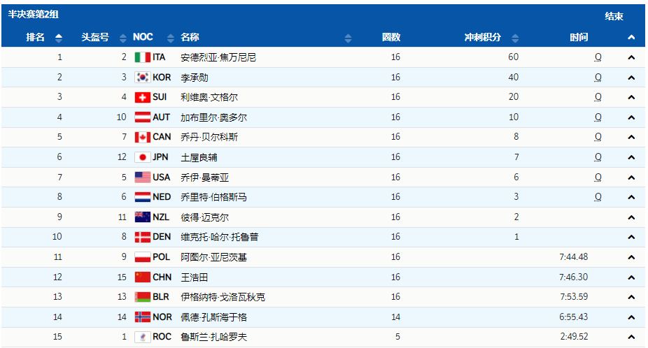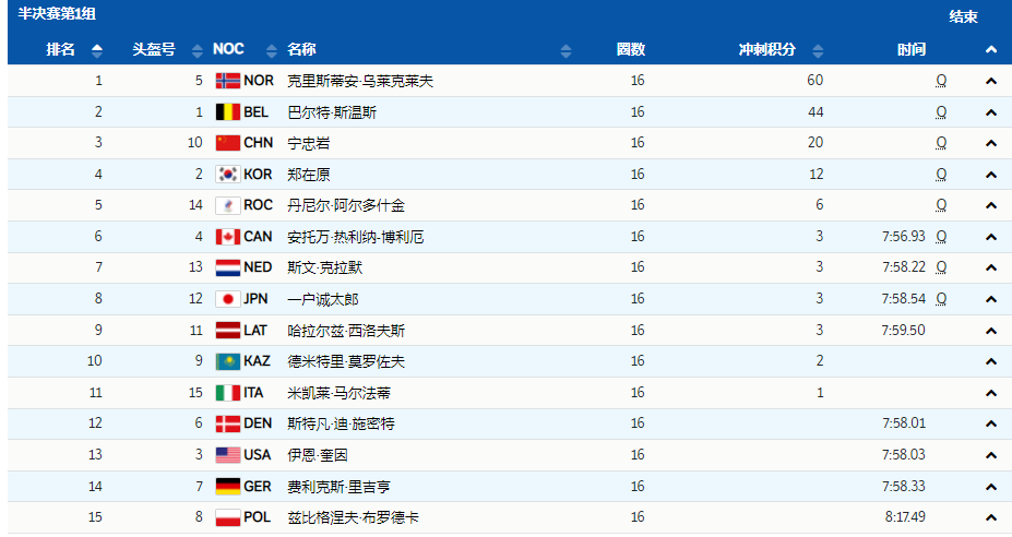 半决赛共30名选手参加,分为两组,选手需要滑行16圈,前8名晋级,最后一圈冲刺排名前三将分别获得60、40和20分的冲刺积分,这也是最终排名的前三位,其他选手的排名通过第4、8、12和16圈的冲刺积分(优先)或者最终抵达终点所用时间确定。