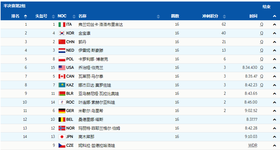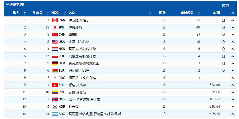 第一组半决赛,中国选手李奇时在第一个冲刺点拿到3个积分。随后几圈李奇时一直采用跟滑战术;第14圈,李奇时一举冲至第2位;最终冲刺阶段,李奇时第三位冲个终点获得20个积分,顺利晋级决赛。加拿大选手布隆丁位列第一,日本选手佐藤绫乃排名第二。