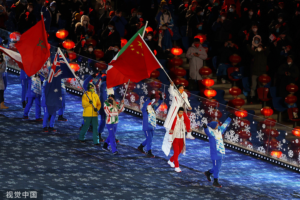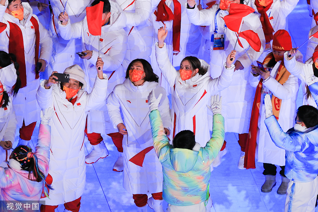 旗手高亭宇即使是“负重”依然走得稳健,脚步生风很有气势,徐梦桃更是卖力将国旗举高挥舞。两个人看起来和谐又可爱,网友们打趣:这两个人真是诠释了什么叫“更高、更快、更强、更团结”。