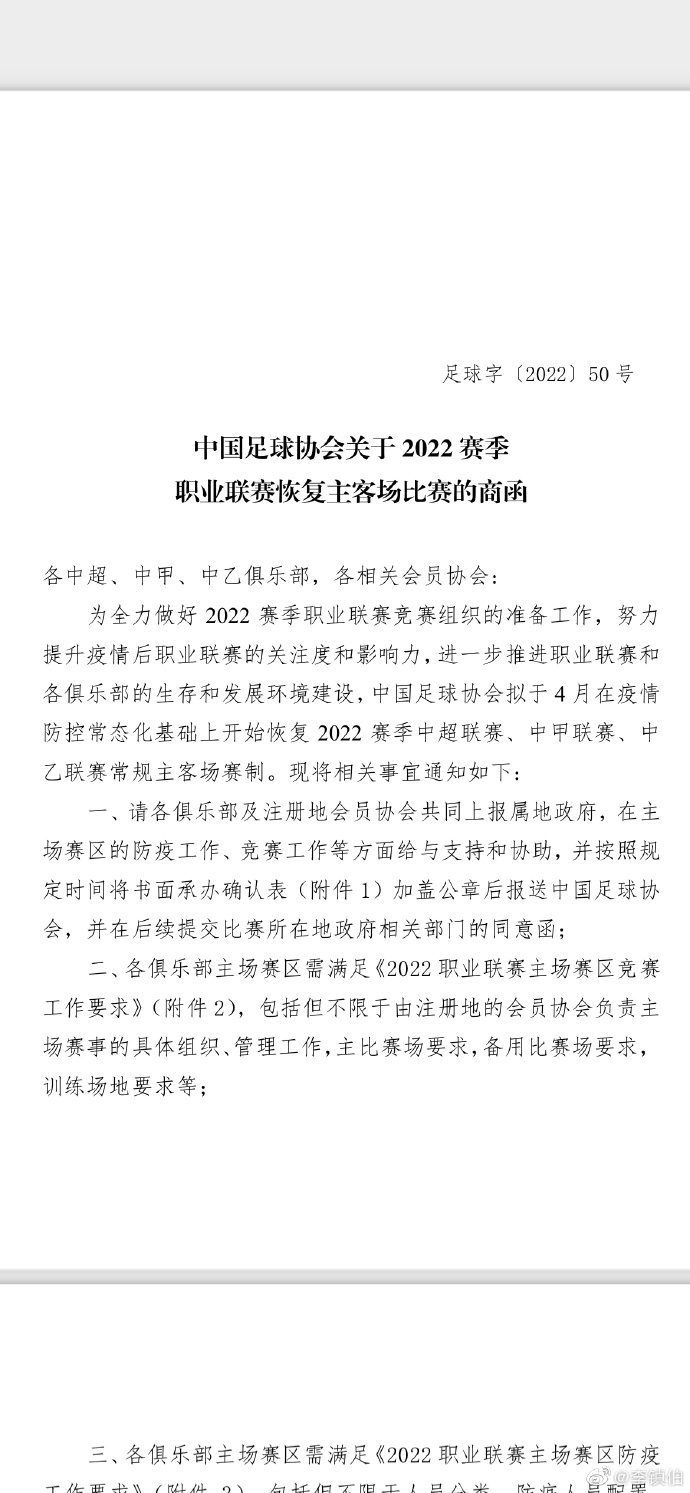 为全力做好2022赛季职业联赛竞赛组织的准备工作,努力提升疫情后职业联赛的关注度和影响力,进一步推进职业联赛和各俱乐部的生存和发展环境建设,中国足球协会拟于4月在疫情防控常态化基础上开始恢复2022赛季中超联赛、中甲联赛、中乙联赛常规主客场赛制。