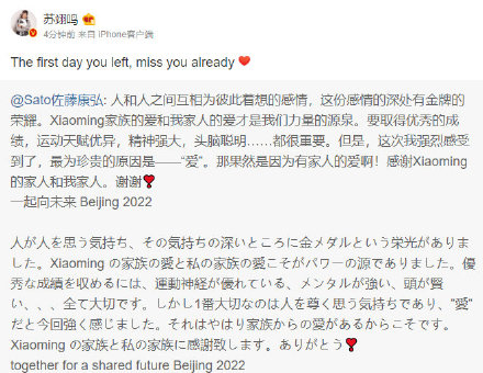 北京时间2月23日,苏翊鸣转发教练佐藤康弘在冬奥会闭幕后感谢苏翊鸣家人和自己家人的微博,并且写道:“The first day you left, miss you already (你离开的第一天,我已经开始想你)”