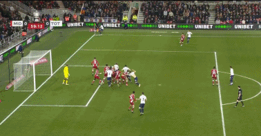 第65分钟,米德尔斯堡通过战术任意球打出配合,豪森起脚兜射偏出。