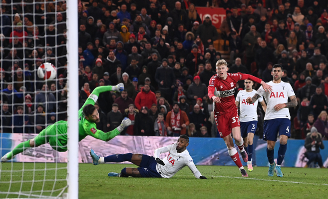 2021/22赛季英格兰足总杯第5轮——热刺加时赛客场0-1爆冷不敌米德尔斯堡遭淘汰:上半时,多尔蒂晃过门将后射空门高出横梁,随后还有一脚远射稍稍偏出立柱。下半时,戴尔主罚高质量任意球被扑出,哈里-凯恩角球进攻中破门被判越位无效,孙兴慜补时阶段错失头球绝杀良机。加时赛中,塔韦尼耶后点推射遭洛里神勇化解,但主队19岁小将乔希-科伯恩与队友配合后突入禁区抽射绝杀>>