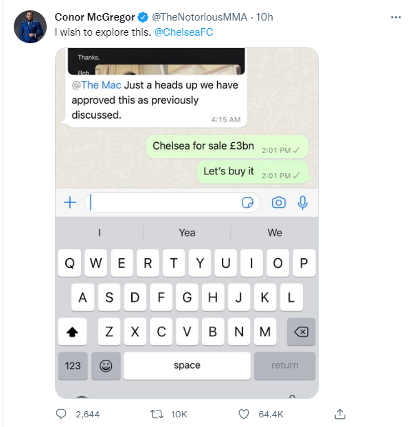 在切尔西公告发出后,康纳在个人社交媒体上放出了一张聊天截图,配文写道“我想聊聊这个@切尔西”。在聊天截图中康纳说:“切尔西标价30亿镑出售,我们把他买下来吧。”