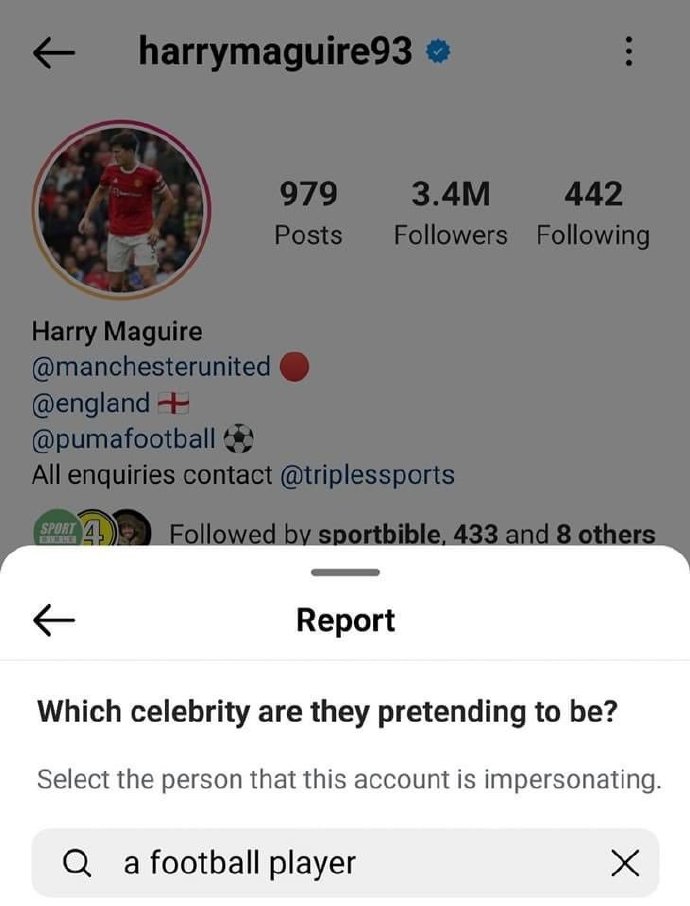 有网友晒出,马奎尔的个人社交媒体账号遭到了举报,理由竟是“冒充足球运动员”。